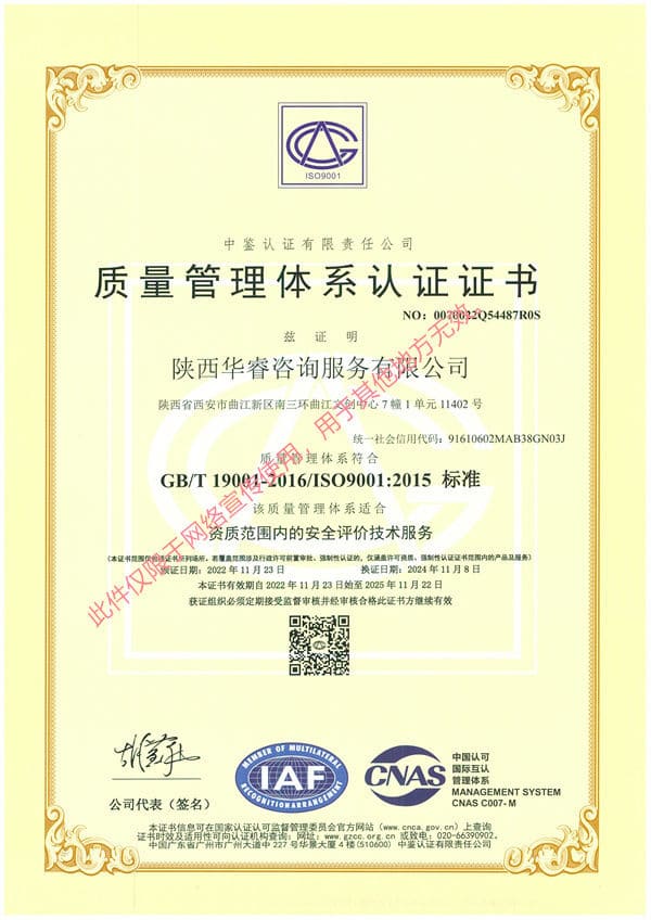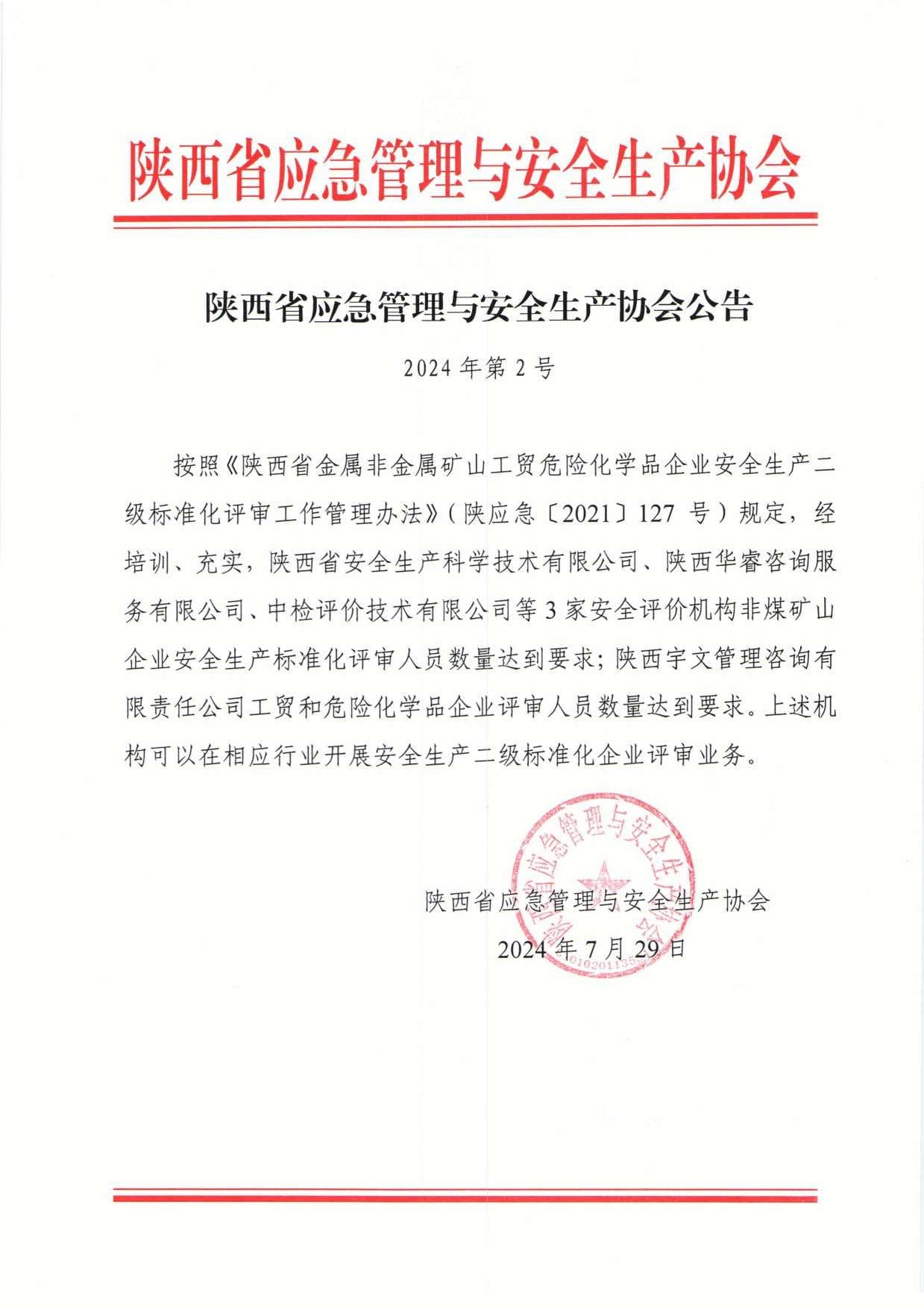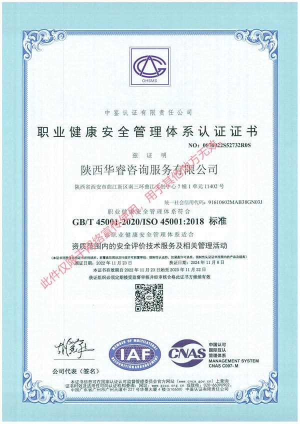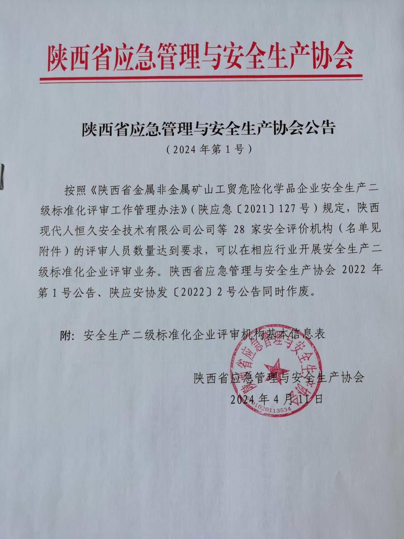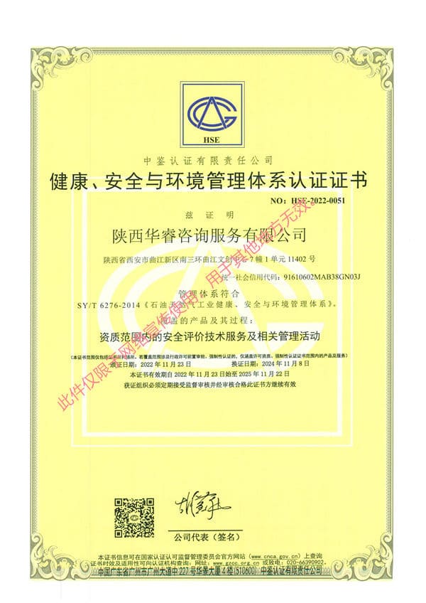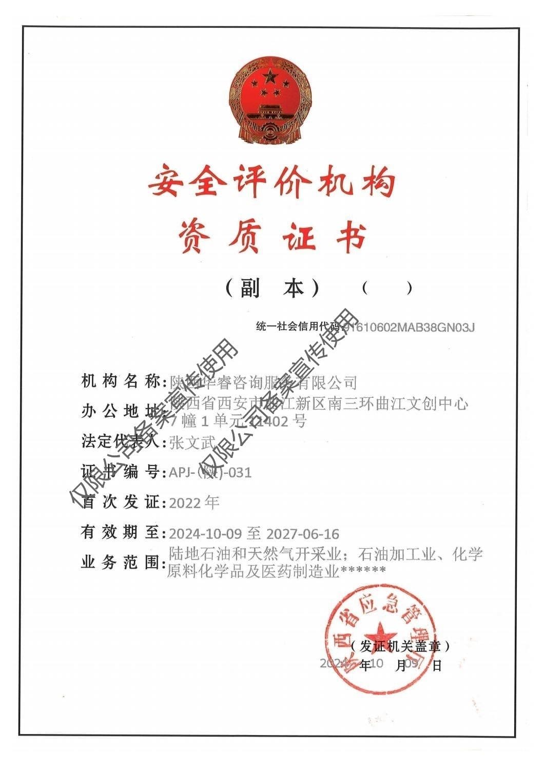 公司拥有陕西省应急管理厅颁发的安全评价机构资质证书,证书编号:APJ-(陕)-031,资质范围包括:陆地石油和天然气开采业;石油加工业、化学原料、化学品及医药制造业。